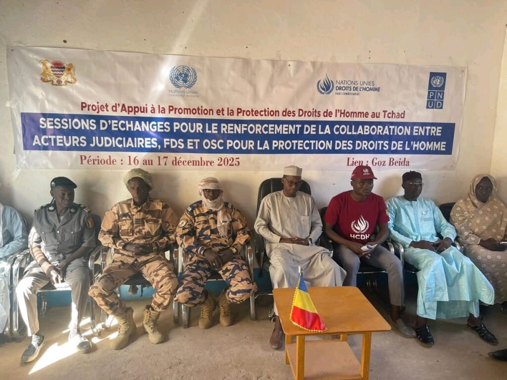 Le Haut-Commissariat des Nations Unies aux droits de l’homme (HCDH) organise, du 16 au 17 décembre 2025, à Goz-Beïda, une session d’échanges interinstitutionnelle réunissant les acteurs judiciaires, les forces de défense et de sécurité (FDS) ainsi que les organisations de la société civile (OSC), dans le cadre du projet d’Appui à la Promotion et à la Protection des Droits de l’Homme.